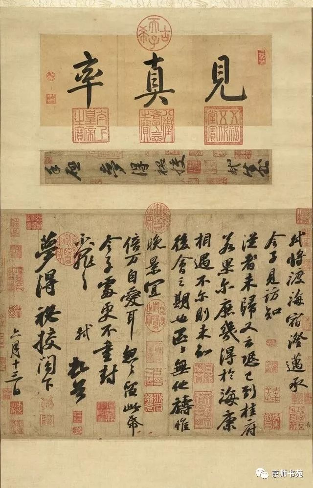 苏轼《渡海帖》,亦名《致梦得秘校尺牍》,纸本,行书,28.6X40.2 cm,台北故宫博物院藏。此帖书于宋元丰三年(1100),是年苏东坡六十五岁,被赦后,终于可以从海南岛返回大陆中原了。渡海前夕,想与故人见上一面,但不巧错失机缘,苏东坡有一种预感,“未知后会之期也。